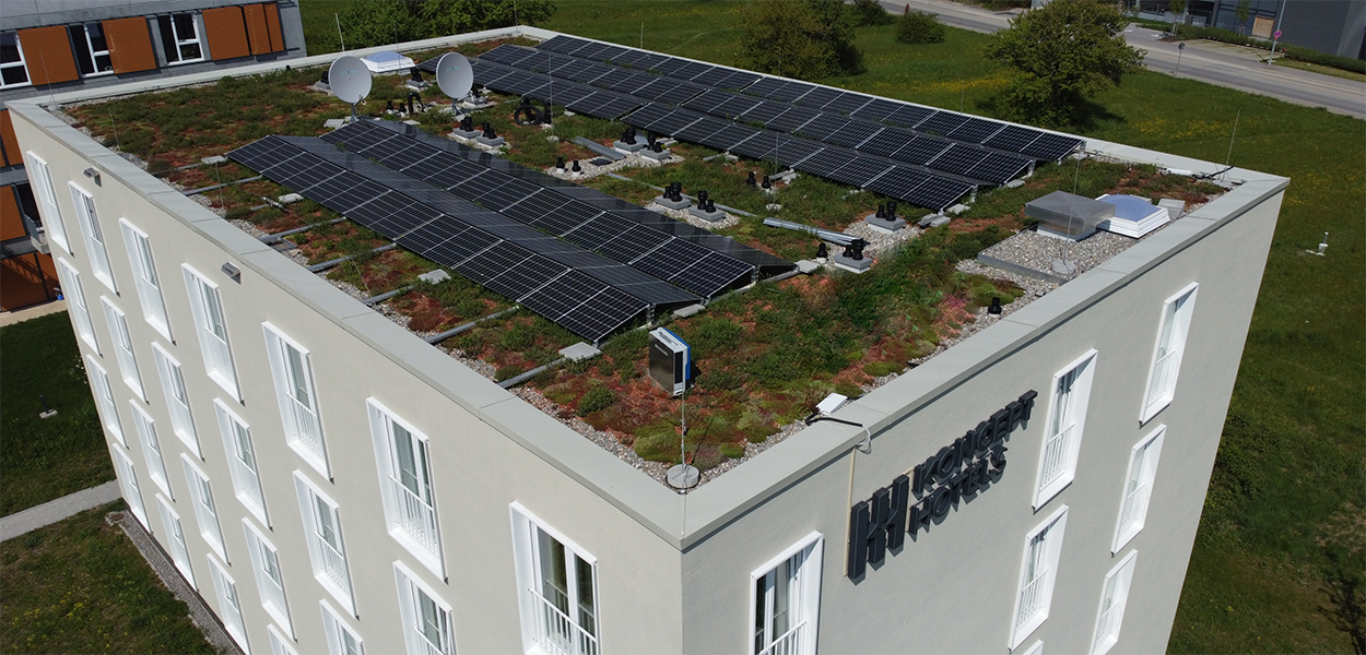 Auf dem Hoteldach errichtet, leisten PV-Module auf einer Fläche von 10 x 15 Meter bis zu 30 kWp. Das entspricht rund 30.000 kWh jährlich selbst produzierten Stroms, gewonnen aus der Sonne als regenerativer Energiequelle. Für die Koncept Hotels mit ihren mittlerweile sieben Hotels an fünf Standorten bedeutet die Photovoltaik-Anlage in Tübingen einen weiteren großen Schritt hin zu einem rundum nachhaltigen Gesamtkonzept.