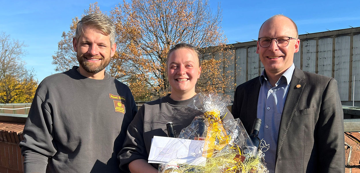 Mit einer Urkunde und einem gebührenden Weinpräsent gratulierten Christian Schätzle, Vorstand Produktion/Oenologie und Manuel Mößner, Leiter Kellerwirtschaft, ganz persönlich zum Erfolg. "Wir schätzen dich und dein Engagement sehr und wünschen Dir weiterhin eine interessante berufliche Laufbahn bei uns im Winzerkeller."