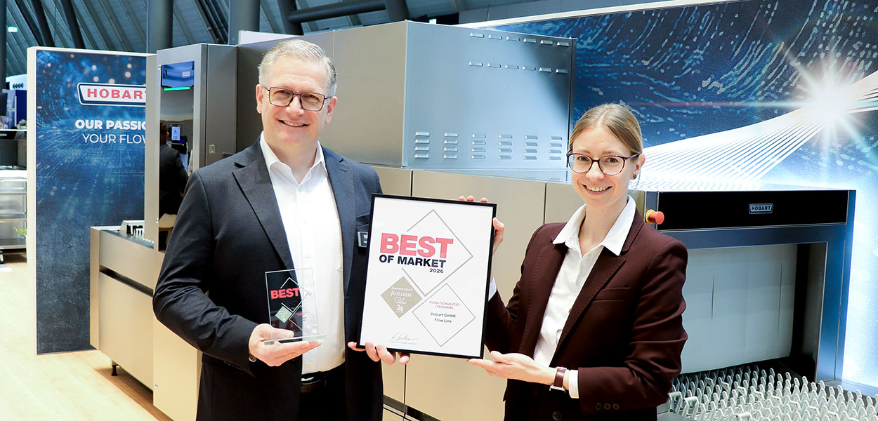 Auf der Fachmesse Intergastra 2026 in Stuttgart erhielt Hobart zum 11. Mal den begehrten Branchen-Award Best of Market. Prämiert wurde die Bandspülmaschine "Flow Line" mit dem dazugehörigen Feature "Smart Vision Control". Damit erhielt das Offenburger Unternehmen eine weitere Auszeichnung für seine professionelle Spültechnik.